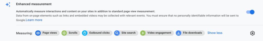 Möchte man in Universal Analytics  Interaktionen erfassen, die unabhängig vom Ladevorgang stattfinden, muss der Webseite Code hinzugefügt werden. Das neue GA bringt hier einen großen Vorteil mit, denn es gibt ausgewählte Ereignisse die automatisch erfasst werden, ohne zusätzlichen Code. Die einzige Voraussetzung hierfür ist, dass der Basiscode fürs neue Google Analytics auf der Webseite implementiert ist bzw. das SDK in der App eingebunden wurde. Sobald die Data Streams eingerichtet sind und die Datenerfassung aktiviert wurde, fließen ins neue GA die sogenannten automatisch erfassten Events bzw. Enhanced Measurement Events ein.