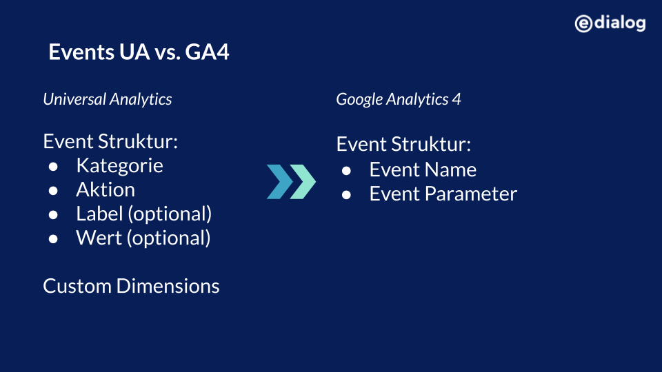 Das bedeutet, die altbekannte Event Struktur von Universal Analytics wird in Google Analytics 4 durch Event-Namen und dazugehörige Event-Parameter abgelöst.