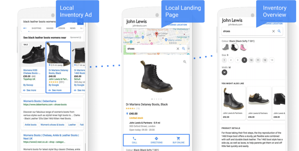 Local Inventory Ads ermöglichen es Unternehmen ihre stationären Geschäfte bei Google zu bewerben, indem das tatsächliche Produktinventar angezeigt wird. Wenn sich Kunden online informieren, sehen sie gleich, in welchen Filialen die gewünschten Artikel verfügbar sind. Zusätzlich können die Geschäfte eine Abholoption anbieten: Die User bestellen online und holen die Produkte noch am selben Tag im Geschäft ab.