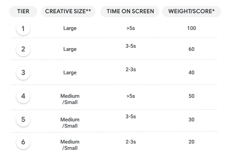 Auch hier könnte man der Einfachheit halber Bidding mit “Maximize Viewable Impressions” einsetzen. Es lohnt sich jedoch, hier noch etwas genauer auf die unterschiedlichen Qualitätsfaktoren einzugehen. Hier im Beispiel-Algorithmus anhand von Creative Size sowie Time on Screen.