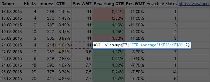 Nun wird es etwas komplexer. Ich möchte nämlich die erwartete CTR mit meiner tatsächlichen CTR abziehen. Kommt ein negativer Wert heraus, liege ich unter der durchschnittlichen CTR. Alles was darüber ist, wird als positiver Wert angezeigt. Die Formel sieht wie folgt aus: