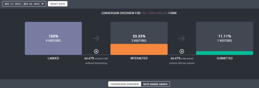 Sehr oft haben unsere Ziele für eine bestimmte Seite etwas mit dem Ausfüllen eines Formulars zu tun: eine Anmeldung zum Newsletter, eine Kontaktanfrage oder das Eingeben von Lieferadresse und Zahlungsinformationen. Die Form Analysis liefert dabei wertvolle Informationen, was den Besucher von einer Conversion abhält. Dazu erhält man für jedes Formular das erfasst wird zwei Infografiken: Zuerst einmal eine Zusammenfassung des Formulars: