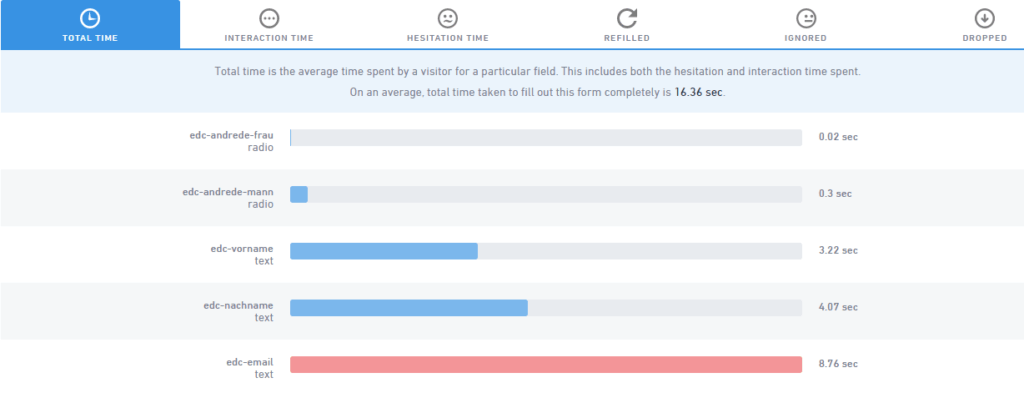 Die zweite Infografik zeigt dann Informationen zu den einzelnen Feldern eines Formulars: Für jedes Feld wird der Name des HTML-Elements sowie dessen Typ, z. B. Dropdown-Box, Textfeld oder Button angezeigt und wie lange der Besucher mit diesem Feld beschäftigt war. Diese Zeiten lassen sich zudem noch aufspalten in Interaction Time (die Zeit, die der Besucher tatsächlich mit dem Ausfüllen verbringt) und die Hesitation Time (wie lange hat das Feld den Fokus, es erfolgt aber keine Eingabe). Dazu erfolgen Prozentangaben, wie zum Beispiel viele Besucher ein Eingabefeld ignorieren, es erneut ausfüllen, etwa weil die Validierung einen Fehler angezeigt hat und wie viele eine Formularfeld zwar anwählen, dann aber nicht ausfüllen.