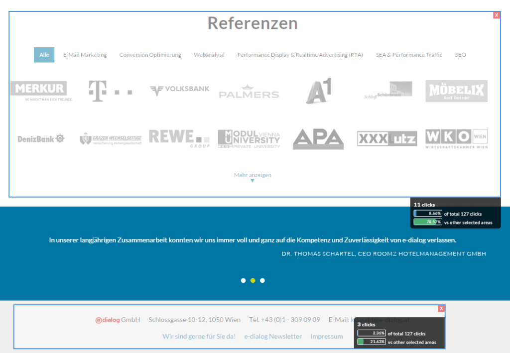 Interessant ist auch die Möglichkeit, anstatt einzelner Elemente, ganze Bereiche einer Seite auswerten zu lassen. Mit der Maus werden einfach Rechtecke aufgezogen, innerhalb derer alle Klicks zusammengefasst werden. In unserem nachfolgenden Beispiel werden die Klicks im Footer und im Bereich Referenzen dargestellt: