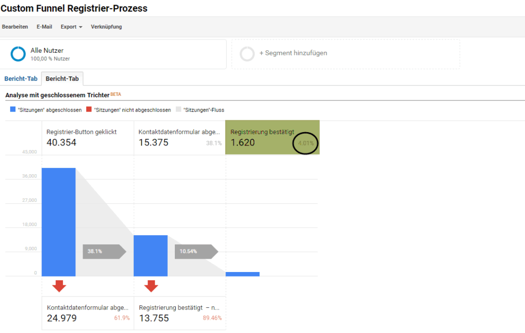 Und ich habe nicht zuviel versprochen: Auf den 1. Blick erkennt man, dass der gesamte Registrierprozess noch stark optimierungsbedürftig ist. Auf den 2. Blick erhält man die Details: Von 40.354 Usern, die auf den Registrierungs-Button geklickt haben, haben nur 4% die Registrierung tatsächlich abgeschlossen. Der Rest ging während der Journey verloren: Ein großer Teil (62%) nach dem 1. Step. Ein noch größerer Teil (89,5%) jedoch nach dem 2. Step, d.h. nachdem die User bereits die meiste Arbeit erledigt haben und nur noch den Link in der Email anklicken müssten.