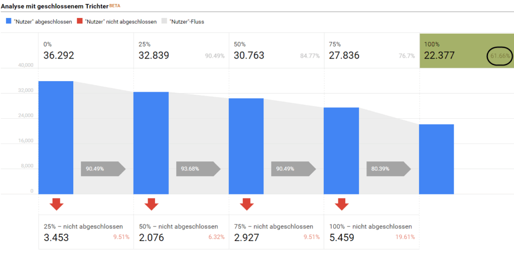 In diesem Fall analysieren wir, ob YouTube-Videos generell angesehen wurden. Und das Ergebnis ist eigentlich sehr schön: Von den 36.292 Usern, die ein Video gestartet haben, haben rund 62% bis zum Ende geschaut. Ein gutes Zeichen – die Videos scheinen interessant zu sein! In einem nächsten Schritt könnte man sich einen weiteren Funnel basteln und im Detail analysieren ob z.B. Videos in Kategorie A besser performen als in Kategorie B, ob kürzere Videos eher bis zum Ende gesehen werden als längere, usw.