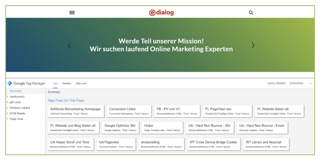 Google Analytics wird weiterhin direkt auf der Seite und nun zusätzlich über den GTM gemessen.