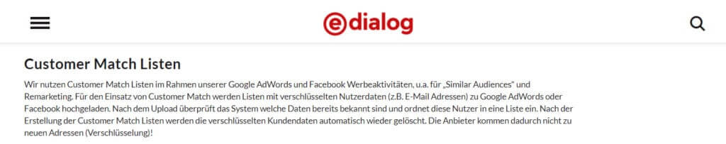 Vor dem Einsatz von Customer Match Listen sollte sichergestellt werden, dass sich in der Datenschutzerklärung ein ausführlicher Hinweis bzgl. der Verwendung von Customer Match Listen befindet. Zur Nutzung von Customer Match Listen ist eine wirksame Einwilligung der Kunden erforderlich. Diese Einwilligung kann z.B. bei Online-Shop Kunden beim Check-out Prozess, beim Opt-In oder durch einen “Cookie-Banner” eingeholt werden. Das Thema Datenschutz ist uns wichtig, daher wurde unsere Datenschutzerklärung um einen Absatz zu Customer Match Listen ergänzt: