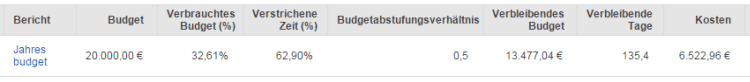 Search Ads 360 bietet die Möglichkeit den Budgetabstufungsbericht eines Jahres- oder Kampagnenbudgets abzurufen. Dadurch ergeben sich umfangreiche Prognosedaten und Angaben zum Zielerreichungsgrad. Der Budgetabstufungsbericht gibt zum Beispiel Auskunft über die bisherigen Kosten, die verstrichene Zeit, das verbleibende Budget, die verbleibenden Tage und das Budgetabstufungsverhältnis. Auf einen Blick wird erkennbar wo man aktuell steht und wie die weitere Prognose ist.