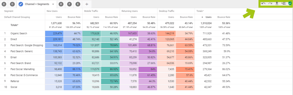 Mit nur wenigen Klicks kann mit der Exploration Funktion eine detaillierte Datenanalyse durchgeführt werden. Per Drag and Drop können Sie Segmente, Dimensionen und Metriken in den Analysebereich ziehen. Die Daten werden gleichzeitig visualisiert und es können sogar mehrere Analyse-Registerkarten in einer einzigen Ansicht angezeigt und direkt verglichen werden.