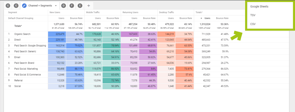 Der Daten Export kann als Google Sheets, TSV oder CSV erfolgen und die Analysen können ganz einfach und praktisch geteilt werden.
