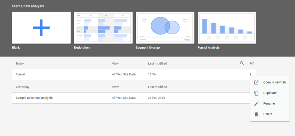 Die drei neuen Techniken, mit denen Sie nachvollziehbare Erkenntnisse darüber gewinnen können, wie sich Nutzer auf Ihrer Website verhalten, lauten Exploration, Funnel Analysis und Segment Overlap.