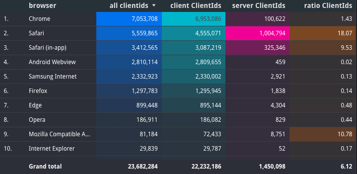 Wie erwartet verzeichnet der Chrome, der Browser mit dem größten Anteil, einen sehr geringen Anteil von nur 1,45 % an serverseitigen ClientIds.