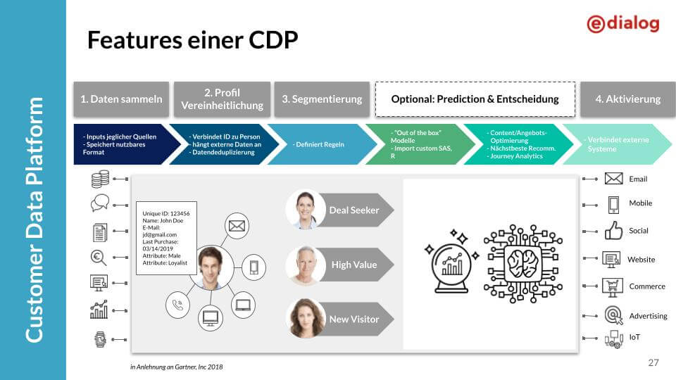 Deswegen können Daten, die in der CDP gespeichert sind, auch von anderen Systemen zur Analyse und zur Verwaltung der Kundeninteraktionen verwendet werden: Beispielsweise in Sozialen Netzwerken für personalisierte Kampagnen oder von Google Analytics (mit Google Optimize) zur Aussteuerung von personalisierten Website-Inhalten. Im besten Fall liefert eine CDP also out-of-the-box Schnittstellen für alle möglichen Marketing Systeme. Damit ist auch schon der Grundstein für die primären Funktionen einer CDP gelegt: