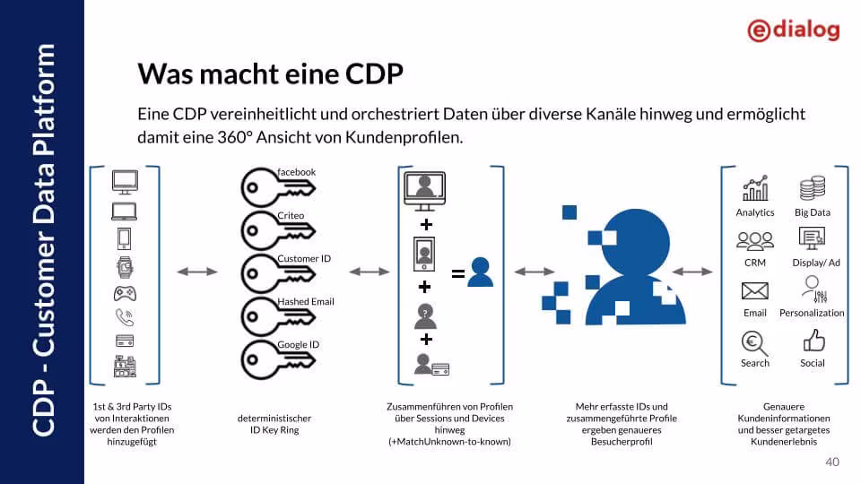 Eine CDP erstellt eine umfassende Sicht auf jeden einzelnen Kunden, indem Daten aus (im besten Fall) ALLEN unternehmensweiten Datenquellen erfasst, verknüpft und gemeinsam abgespeichert werden. Der große Vorteil: Die Verknüpfung basiert auf eindeutigen (unique) IDs und diese wiederum auf persönliche Kundendaten, z.B. der Email Adresse oder Telefonnummer. Erst dadurch können User wiedererkannt und sowohl geräte- als auch kanalübergreifend personalisiert angesprochen werden.