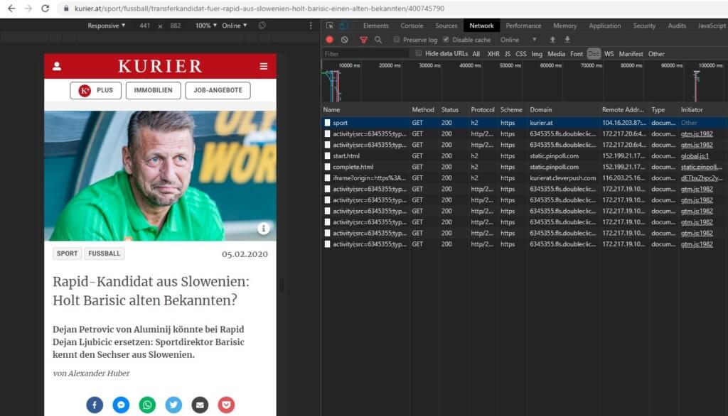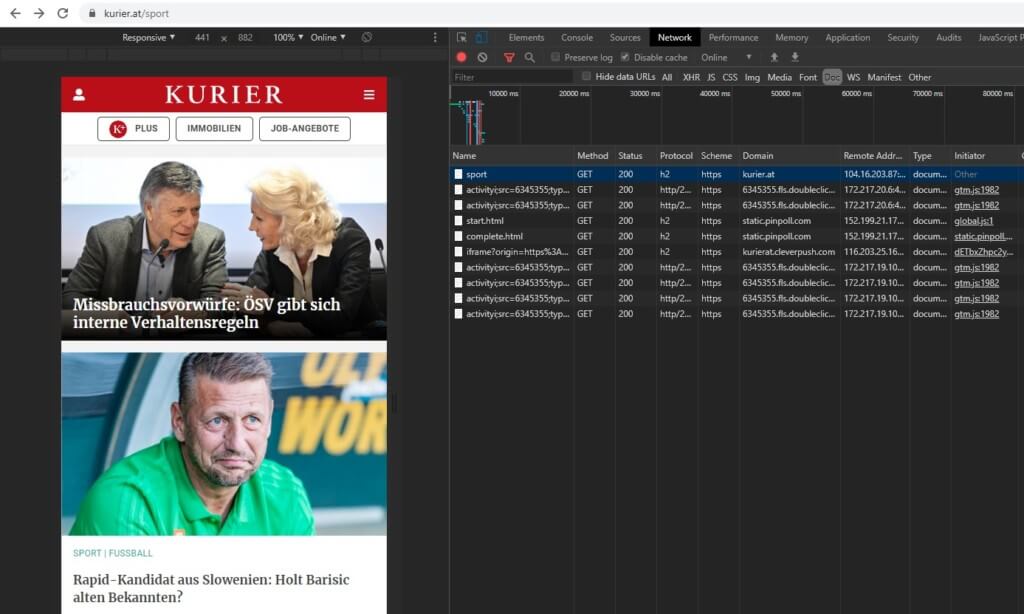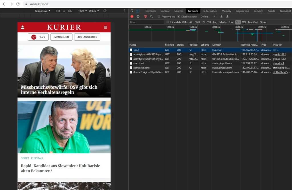 Als Beispiel für eine SPA haben wir die Website kurier.at besucht und folgende Schritte ausgeführt: