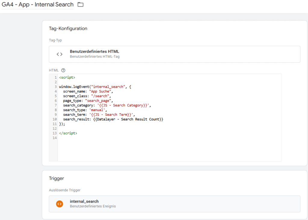 Ist in der Webview ein Google Tag Manager Container vorhanden, kann der folgende Code mittels benutzerdefiniertem HTML Tag Typ eingefügt werden. Für die Herstellung der Schnittstelle ist es nicht zwingend notwendig, diesen Code über den Google Tag Manager zu laden. Er kann auch direkt im Quellcode der Webseite eingebaut werden, welche vom Webview geladen wird.