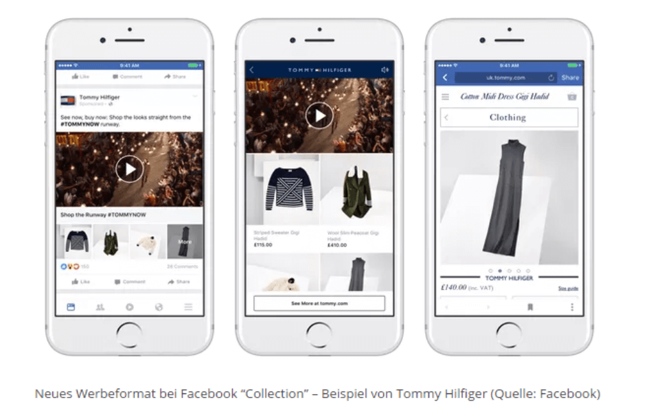 Nutzer, die auf die Werbeanzeige tippen, haben über das Anzeigenformat die Möglichkeit, die Produkte zu durchstöbern oder eine Vollbilderfahrung mit kurzen Ladezeiten zu öffnen, um mehr über die Features eines bestimmten Produkts zu erfahren. Nach dem Einstieg in das Vollbild-Erlebnis führt das Antippen eines bestimmten Bildes auf die Website oder App des Werbetreibenden. Nachteil des Werbemittels: es wird nur auf Mobilgeräten im Facebook- oder Instagram-Feed angezeigt.
