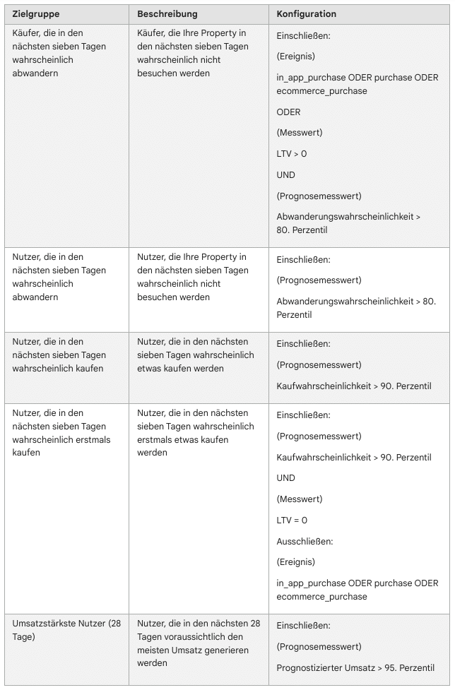 Mithilfe von Predictive Metrics können  Prognose Zielgruppen (Predictive Audiences) zu Abwanderung, Kauf und Umsatz erstellt werden.