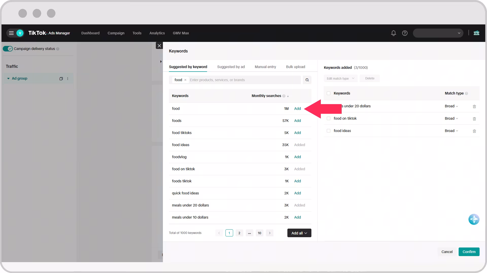 Im Rahmen der Ad-Set Einstellungen können zu der Kampagne bis zu 1.000 Keywords hinzugefügt werden, um die Suche nach dem Produkt abzugreifen. Diese werden entweder basierend auf einem Keyword von Tiktok vorgeschlagen, können manuell oder gesammelt (in Bulk) eingetragen werden. Im Rahmen der Keyword Auswahl basierend auf Vorschlägen von Tiktok, gibt Tiktok das Search Volumen für die ausgewählten Keywords raus – in dem Zug kann auch gleich erfragt werden, ob Search Ads sinnvoll für das jeweilige Produkt sind oder nicht. Hierbei sollte beachtet werden, dass nicht alle Keywords den gleichen Such-Intent haben – der Fokus sollte auf relevanten Keywords liegen, die uns trotzdem ermöglichen, eine gute Zielgruppengröße zu erreichen. Tiktok empfiehlt hier mindestens 20 Keywords und einen guten Mix zwischen Nischen- und Broad-Keywords.