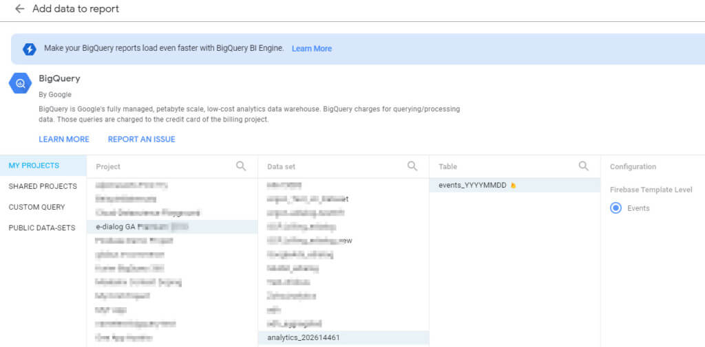 Um die Rohdaten aus GA4 nun in Datastudio nutzen zu können, wählt man als Datenquelle BigQuery aus und verknüpft das entsprechende Dataset. Das Dataset wird immer mit “analytics_” gefolgt von der Property-ID benannt.