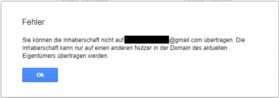 Aktuell funktioniert die Übertragung der Eigentümerschaft nur innerhalb der Domain des aktuellen Eigentümer-Accounts. Andernfalls wird eine Fehlermeldung angezeigt.