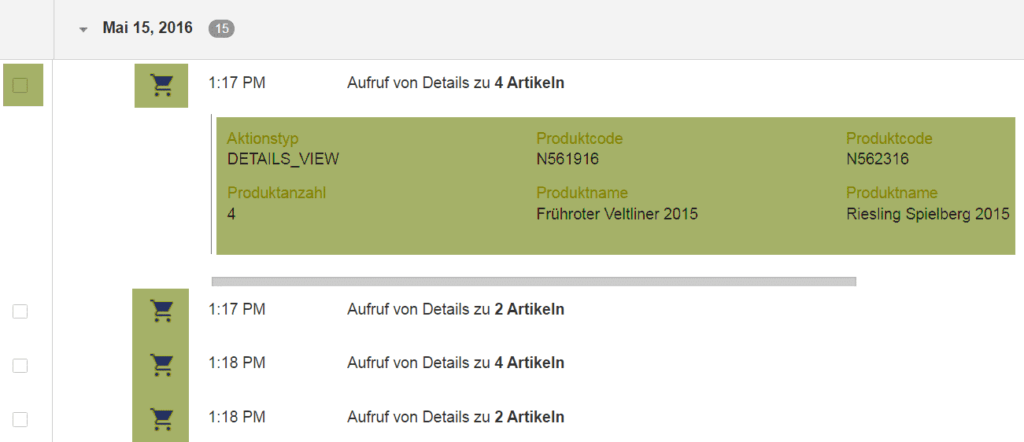 User X hat sich nun 9 Produktdetail-Seiten angesehen bevor er mit dem Checkout Prozess begonnen hat: Auf 7 Detail-Seiten hat der User Produkte in den Warenkorb gelegt – der Frührote Veltliner und der Birnen Aufstrich konnten aber nicht überzeugen.