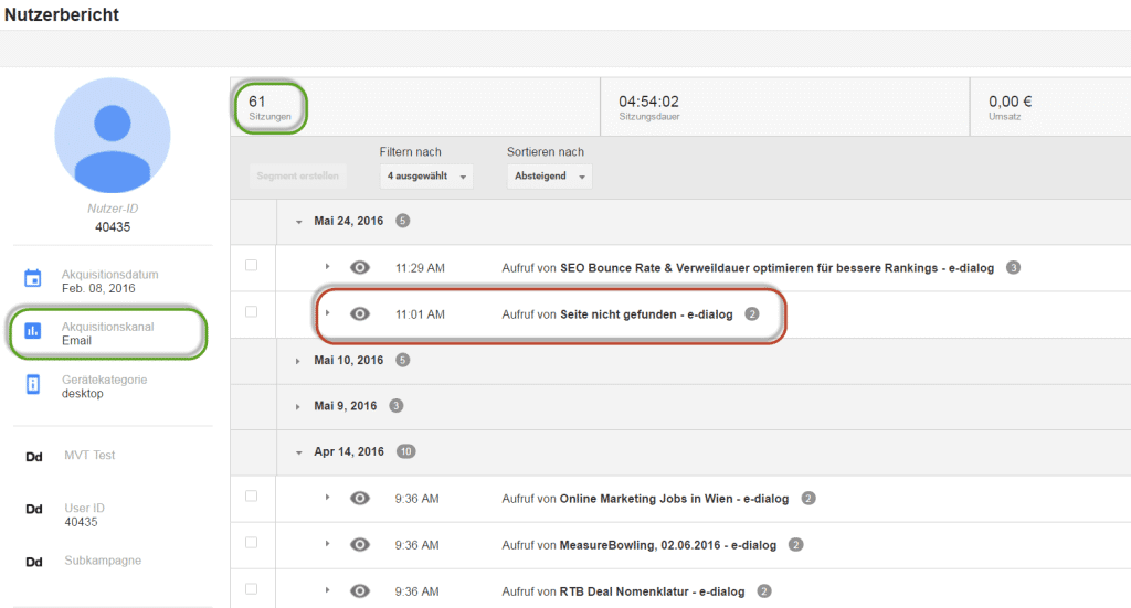 Schauen wir uns dazu den Nutzerbericht (mit primärer Dimension User-ID, d.h. der User wird über mehrere Geräte wiedererkannt) eines Users (in Folge “User A”) unserer e-dialog Website an: