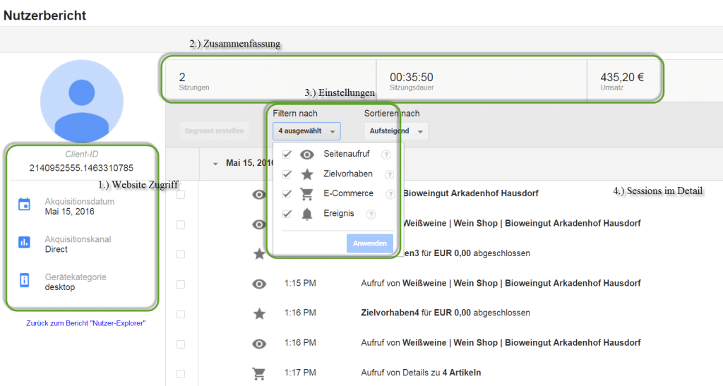 - Zusammenfassung: In der Spalte rechts ganz oben werden die Anzahl der Sitzungen, die Sitzungsdauer und der Umsatz des Users zusammenfassend angezeigt. User X hatte also 2 Sitzungen, die in Summe ca. 36 Minuten gedauert haben und er hat um 435,20 Euro eingekauft.