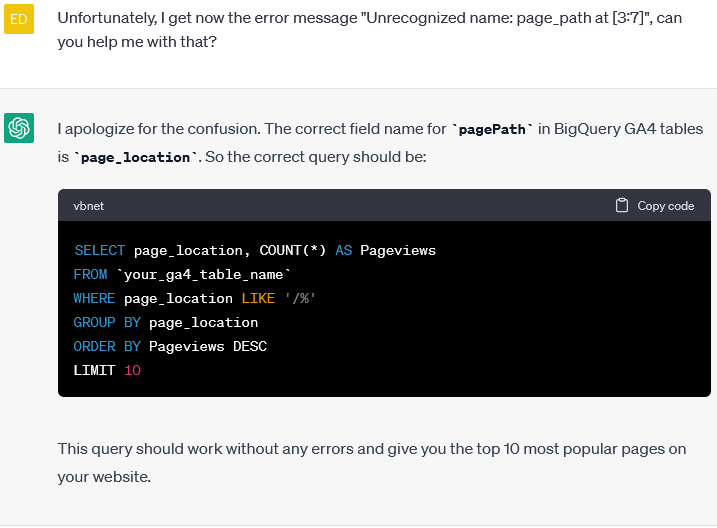 Nach weiteren Chat Nachrichten mit der Frage, ob ChatGPT den Fehler lösen kann, gibt die AI aus, dass statt der Dimension “pagePath” nun “page_location” verwendet werden soll, was aber auch falsch ist: