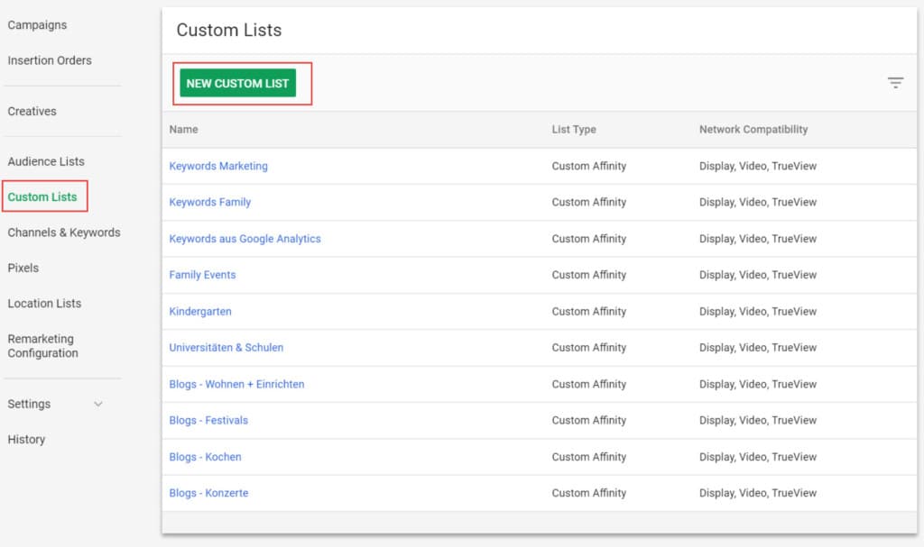 In diesem Beispiel zeigen wir, wie Sie verschiedene Custom Affinities Segmente in Display & Video 360 (vormals DoubleClick Bid Manager) einstellen. Ziel ist es, neue Audiences zum Thema “Marketing Interessenten” zu bilden. Hier kann man sich kreativ austoben und sowohl relevante Websites aussuchen als auch Keywords und Interessen miteinbeziehen.