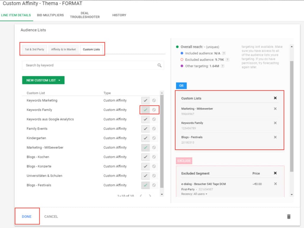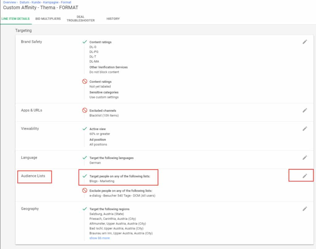 Mit einem Klick auf “Bearbeiten”, öffnet sich ein neues Fenster. In dieser Übersicht kann auf die 1st & 3rd Party Daten, Affinity & In-Market Kategorien sowie die Custom Lists zugegriffen werden um diese einer LineItem zuzuordnen.