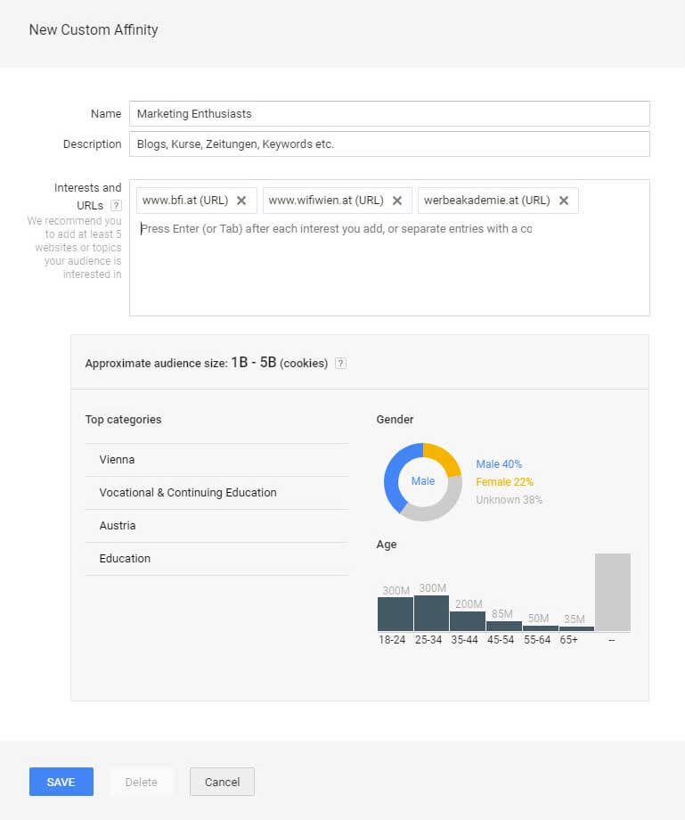 Je nach Kunde und Produkt kann man bei der Erstellung von Custom Affinities beliebige Segmente, welche auf einer Kombination aus Interessen, URLs, Keywords,  Apps (nur bei Video &YouTube) usw.  basieren,  bilden.  Durch die selbst definierten, auf das Produkt maßgeschneiderte Segmente, können Zielgruppen erreicht werden,  die sich möglicherweise für die gleichen Produkte und/oder Dienstleistungen interessieren.