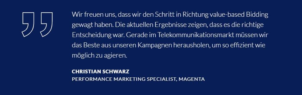 Aber auch bei unserem bestehenden Kunden Magenta konnten wir durch den Einsatz von SA360 die Effizienz der Kampagnen nochmals auf ein neues Level heben. Im Vergleich zum bisher identischen Setup konnten wir durch den Fokus auf Value-Based Bidding eine Steigerung des Conversion-Wertes um 19 % herbeiführen. Die weiteren KPIs wie bspw. Klicks konnten in diesem Fall sogar um 8 % gesteigert werden und das bei einem 10 % niedrigerem CPC.