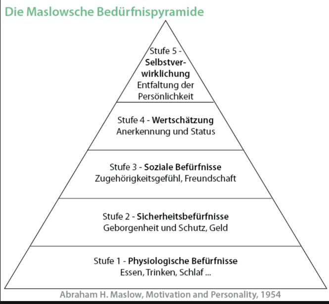 Abraham Maslow beschreibt in seiner berühmten Maslowsche Pyramide auf einfache Art und Weise menschliche Bedürfnisse und Motivationen (in einer hierarchischen Struktur) und versucht, diese zu erklären.