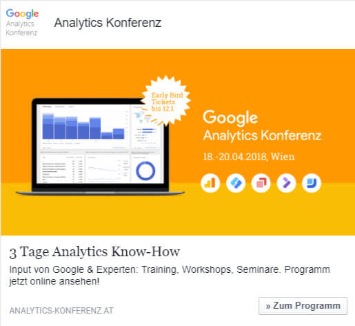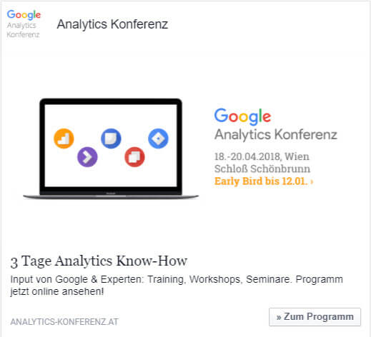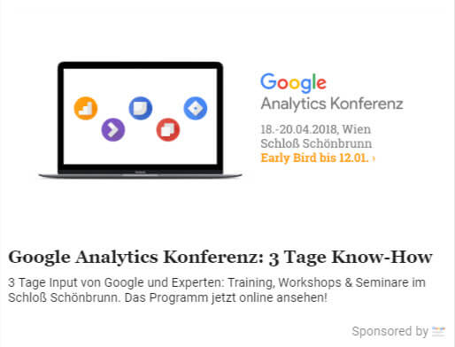 Die Native Ads haben bei unseren eigenen Kampagnen einen hohen Stellenwert. Bei der Bewerbung unserer Google Analytics Konferenz 2018 war der Einsatz dieses Werbeformats unabdingbar.