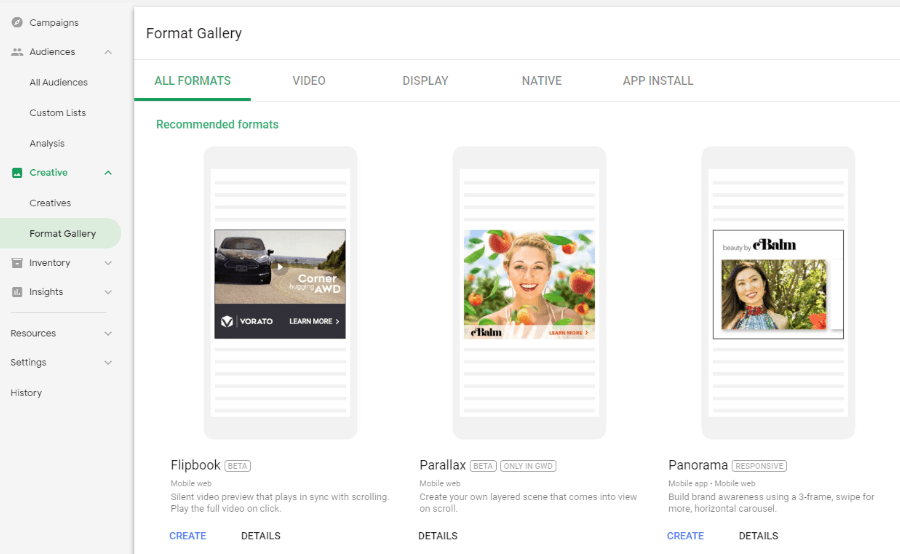 In der Display & Video 360 Format Gallery können ohne Grafikkenntnisse ansprechende Display, Video, oder Native Formate erstellt werden. Eine genaue Beschreibung der Funktionen haben wir im Format Gallery Blogartikel beschrieben.