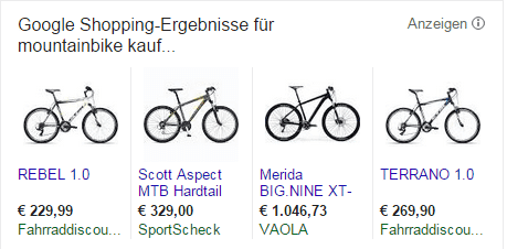 Search Ads 360 unterstützt Google Shopping Kampagnen für Anzeigen mit Produktinformationen, welche z.B. Bild, Titel, Preis, sowie Ihren Unternehmensnamen beinhalten.