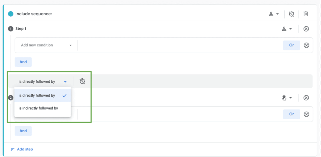 Was hier aber definitiv als Top Feature für fortgeschrittene Analysen genannt werden muss, ist die Möglichkeit von Reihenfolgen (Sequences). Mittels dieser Funktion können Schritte definiert werden, die ein User einhalten muss, um dem Segment hinzu gerechnet zu werden. Es kann sogar granular entschieden werden, ob der Schritt direkt oder indirekt erfolgt ist und in welchem Zeitrahmen.
