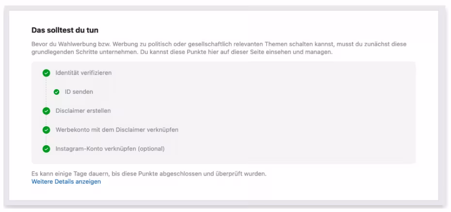 6. Das war’s auch schon 🙂 Nun kann es zwischen 24 und 48 Stunden dauern, bis der Disclaimer von Meta überprüft wird. Der Status kann jederzeit im Bereich “Wahlwerbung bzw. Werbung zu politisch oder gesellschaftlich relevanten Themen” eingesehen werden.