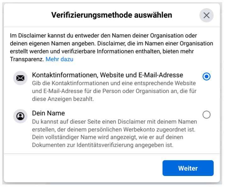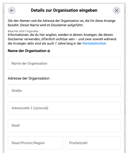 Aus Transparenzgründen wird bei jeder politischen Anzeige auf Facebook und Instagram offengelegt, wer die Anzeige finanziert. Deswegen solltest du vorher abklären, wer als Finanzierunsquelle genannt werden soll.