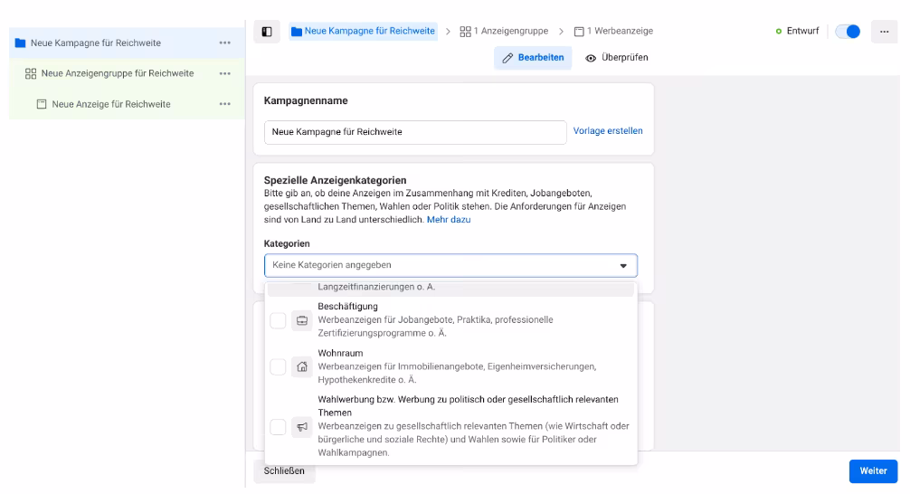 Alles was du dafür machen musst ist bei einer neuen Kampagne die sogenannte “Spezielle Anzeigenkategorie” für Wahlwerbung auswählen: