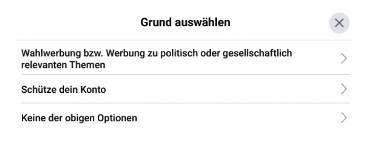 Achtung: Wenn die angesprochene Kategorie nicht ausgewählt wird und trotzdem politische Inhalte geschalten werden, kann es zu einer Konto-Sperrung kommen.