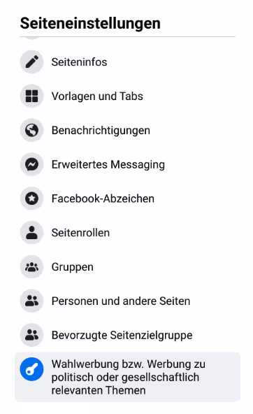 1. Seiteneinstellungen öffnen und in den Bereich “Wahlwerbung bzw. Werbung zu politisch oder gesellschaftlich relevanten Themen” wechseln.