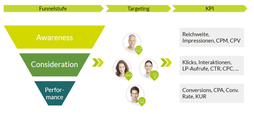 Je nachdem, welches Ziel verfolgt wird, werden unterschiedliche KPIs für die Bewertung herangezogen. In Kampagnen, die auf Reichweite optimiert sind, macht es keinen Sinn Conversions auszuwerten und im Gegenzug kann man von keiner Conversion-Kampagne eine hohe Reichweite erwarten. Je nach Funnelstufe und gewähltem Werbeziel, bieten sich andere KPIs zur Bewertung an: