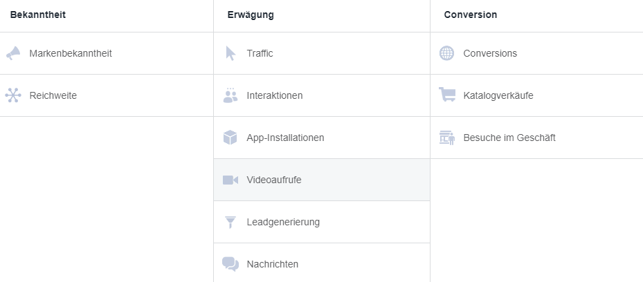 Während es in der Phase Bekanntheit mit den Subzielen Markenbekanntheit und Reichweite, darum geht Interesse für ein Produkt oder eine Dienstleistung zu schaffen, sind in den folgenden Phasen Erwägung und Conversion aktive Handlungen wie beispielsweise Klicks, Videoaufrufe oder Käufe erwünscht. Voraussetzung für Kampagnen mit dem Werbeziel Conversion ist ein funktionierendes Conversion Tracking über den Facebook Pixel.