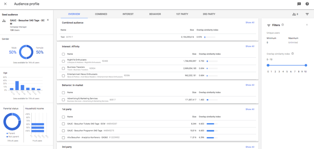 Die nächste DMP Funktion in DV360. Der Analyzer hilft dabei zu ermitteln, welche Überschneidungen es zwischen einer 1st Party Audience zu anderen Zielgruppen in DV360 gibt, zB Google-Daten, aber auch 3rd Party Daten. So können ähnliche Zielgruppen und Überschneidungen erkannt werden. Auf Basis dieser Erkenntnisse könnt ihr entweder eine optimale Audience gebilden oder neue Targetings finden und so die Reichweite der Kampagne insgesamt steigern.
