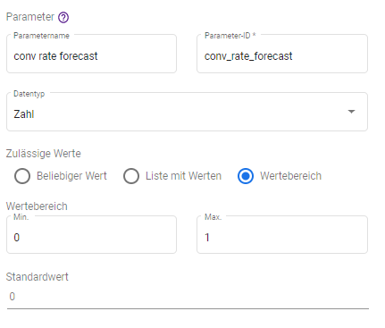 Für unseren Case nehmen wir beispielsweise an, dass Sie die Conversion-Rate Ihrer Kampagnen simulieren wollen, um einen Business Case zu rechnen und für diesen Zweck einen Parameter erstellen.
