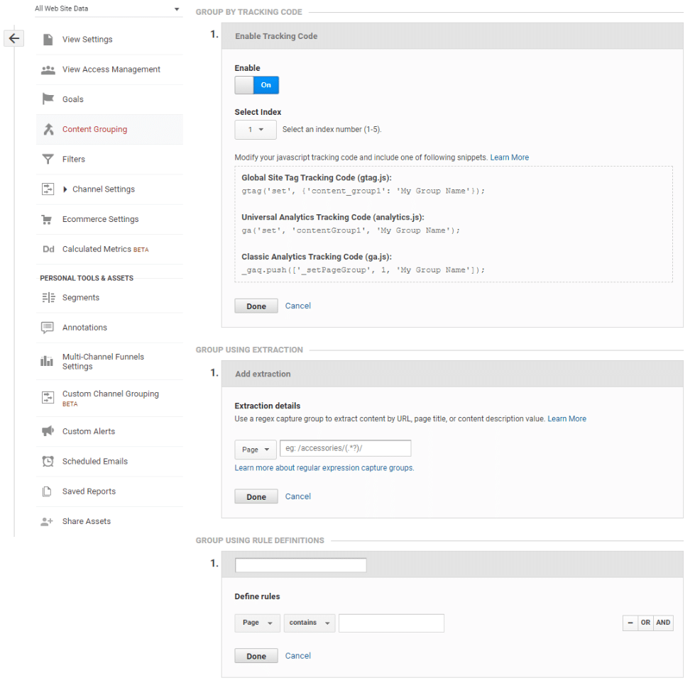 Content-Gruppen können in UA auf zwei verschiedene Arten erstellt werden – über das Analytics Interface oder den Google Tag Manager (GTM).