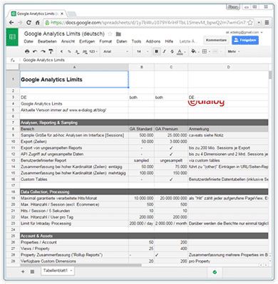 Als einer der ersten Google Analytics Certified Professionals und Google Analytics 360 Reseller reizen wir bei unseren Kundenprojekten sehr oft alle Möglichkeiten aus. Leider ist immer viel Rechercheaufwand nötig, um die tatsächlichen Limits zu bekommen; sie sind mitunter verstreut, wenn überhaupt öffentlich auffindbar, oder veraltet. Unser Dank gilt an dieser Stelle Brian Clifton für seinen 2012 veröffentlichten Artikel!